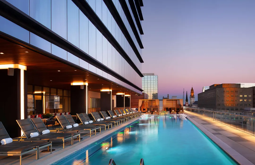 The hotel features a full-service spa and an outdoor swimming pool, as well as a fitness center for exercise. Guests can enjoy access to Nashville Yards, a park for walks or gatherings, creating a blend of leisure activities.