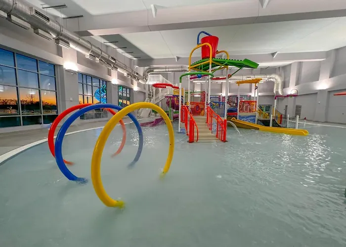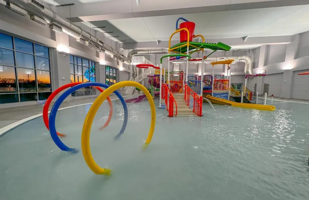 Leisure facilities include a fitness center, indoor pool, hot tub, and an indoor water park with two water slides. Families may benefit from the complimentary water park wristbands provided.