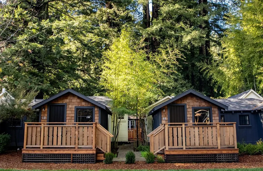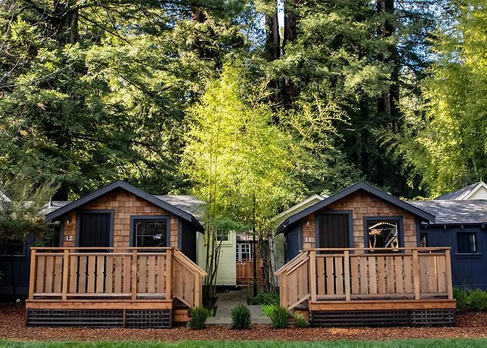 Dawn Ranch, a 4-star Guerneville hotel, features 86 luxury accommodations including cabins and bungalows, set amidst ancient redwoods. Guests can enjoy farm-to-table dining at Agriculture Public House, alongside numerous outdoor activities such as kayaking and bird watching.