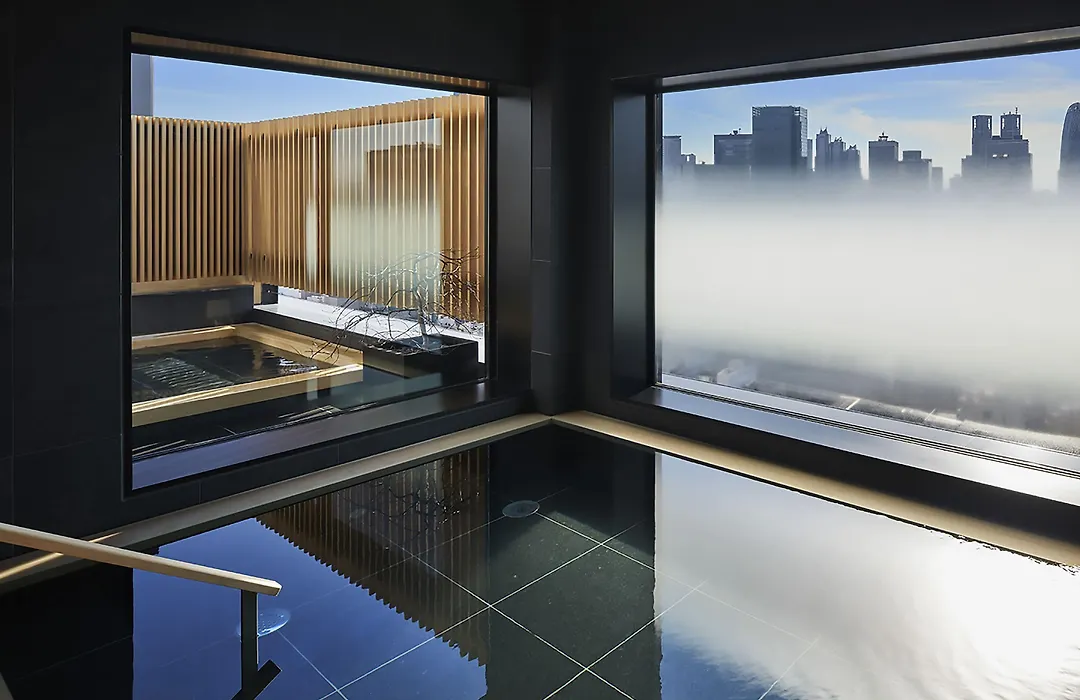 Leisure activities at Onsen Ryokan Yuen Shinjuku include hot springs, providing relaxation amidst the city's chaos. The hotel's design features elements such as a serene 20-metre walkway lined with bamboo and a minimal lobby that serves as a calming entry point.