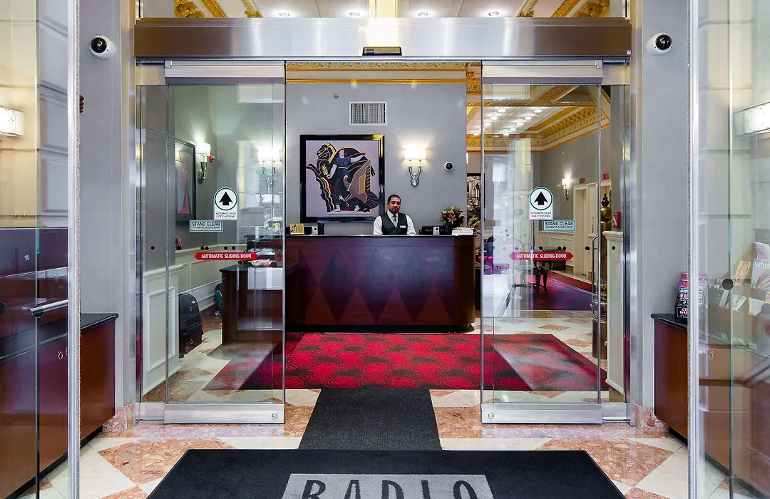 Radio City Apartments features a 24-hour front desk and a historic lobby area adorned with ornate gold accents and stained glass windows. A second-floor workstation with vending options is accessible via the historic iron staircase, encouraging collaboration and guest interaction.