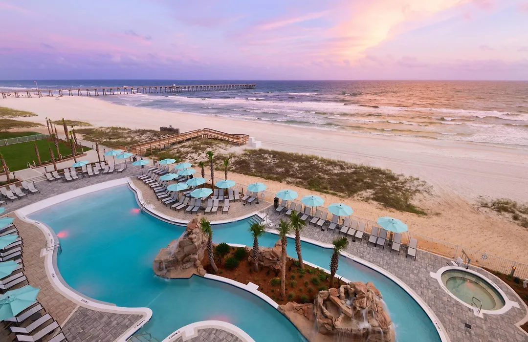 Leisure activities at the hotel include an outdoor pool, lazy river, hot tub, and beach access. The hotel is steps away from attractions such as Shipwreck Island Waterpark, Pier Park, and Frank Brown Park, offering various recreational options.