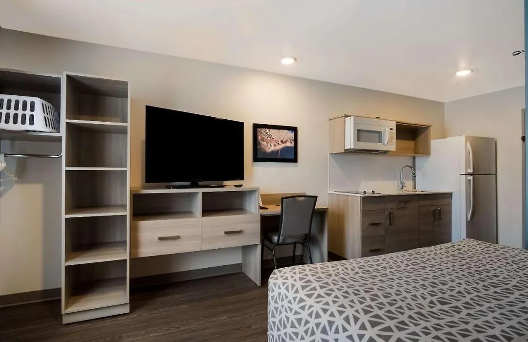 Rooms at Woodspring Suites are air-conditioned and feature a kitchenette with a stovetop, refrigerator, and microwave, ideal for meal preparation. Units include a flat-screen TV with streaming services and a seating area, providing a comfortable space for relaxation.